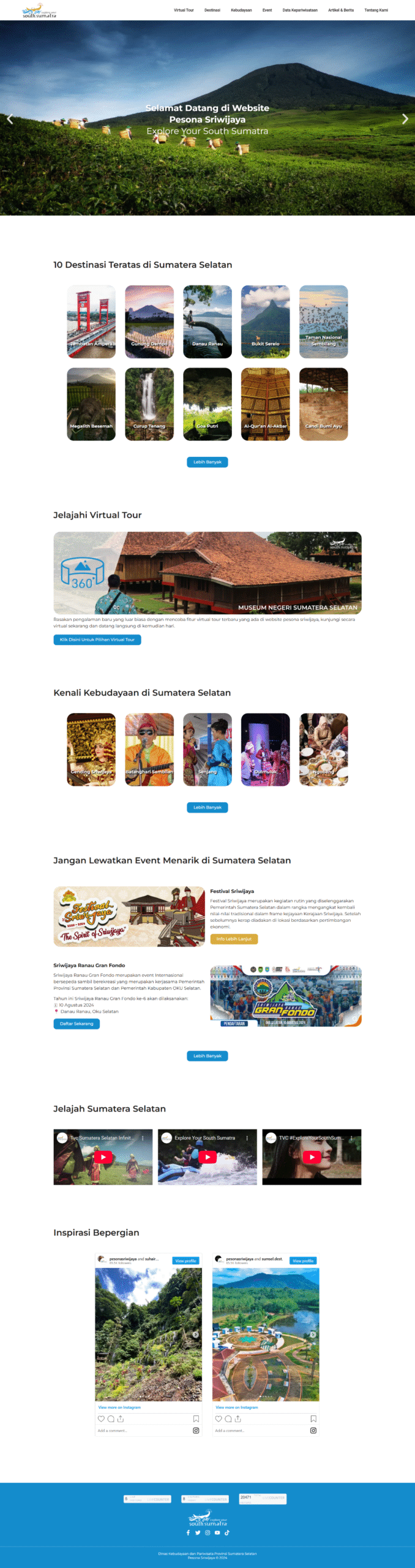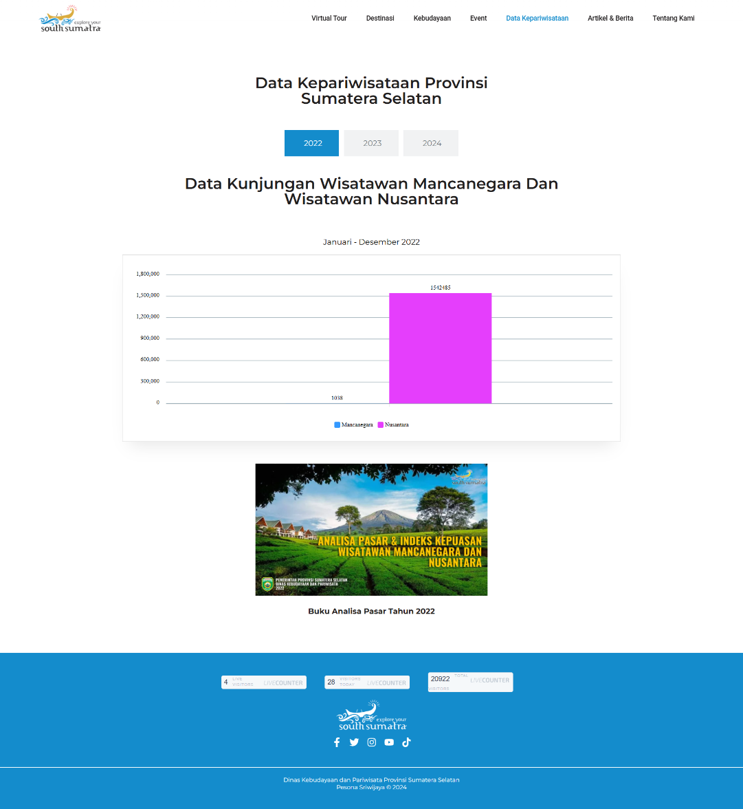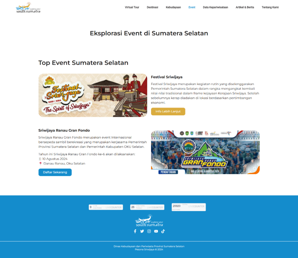 The Pesona Sriwijaya website has successfully transformed the digital presence of South Sumatra’s tourism sector. The 360 Virtual Tour has garnered significant attention, increasing user engagement and providing a unique value proposition for potential visitors. The comprehensive catalog and up-to-date information have made the website the go-to reference for travelers, leading to increased awareness and interest in the region’s attractions and events. This project effectively positions South Sumatra as a modern, accessible, and culturally rich destination, contributing directly to the province’s tourism promotion goals and enhancing its global appeal.