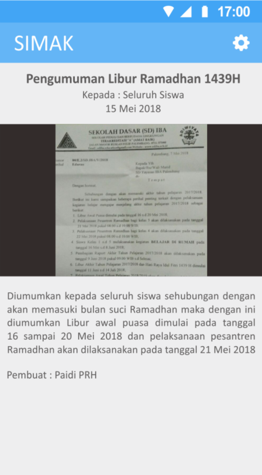 I developed SIMAK, a comprehensive Android mobile application built with Java for SD Yayasan IBA. This app serves as a central communication hub, significantly simplifying the exchange of vital information between the school and parents.